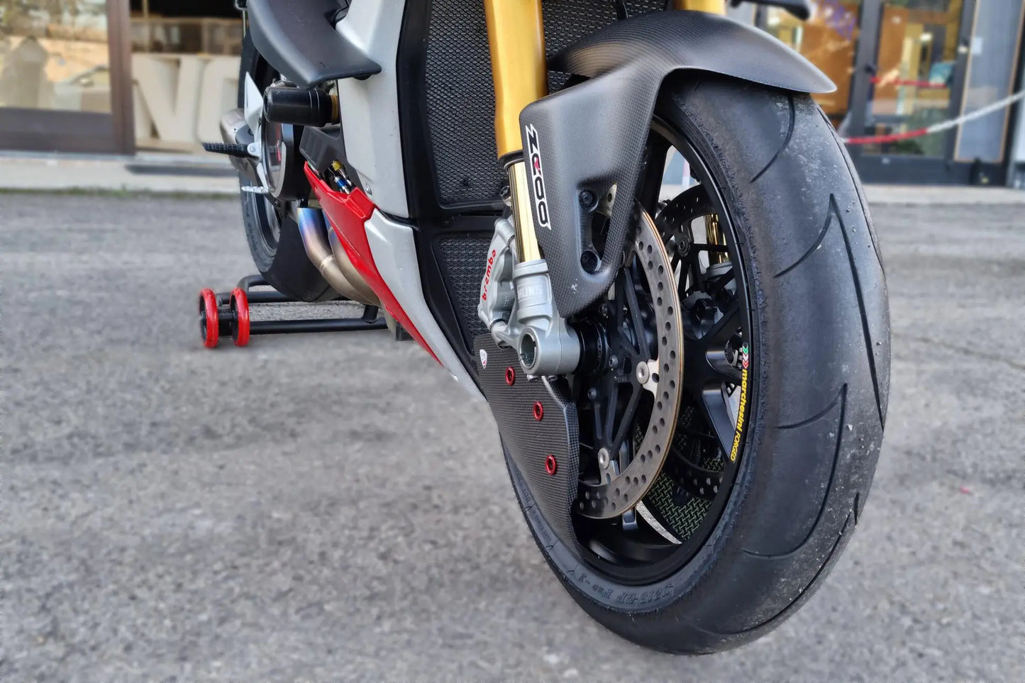 Fabriqué en collaboration avec des équipes partenaires en MotoGP et WorldSBK, ce kit se distingue par ses conduits en fibre de carbone et Kevlar, conçus via un processus en autoclave. Les supports, usinés dans un alliage léger et anodisés, garantissent robustesse et durabilité.