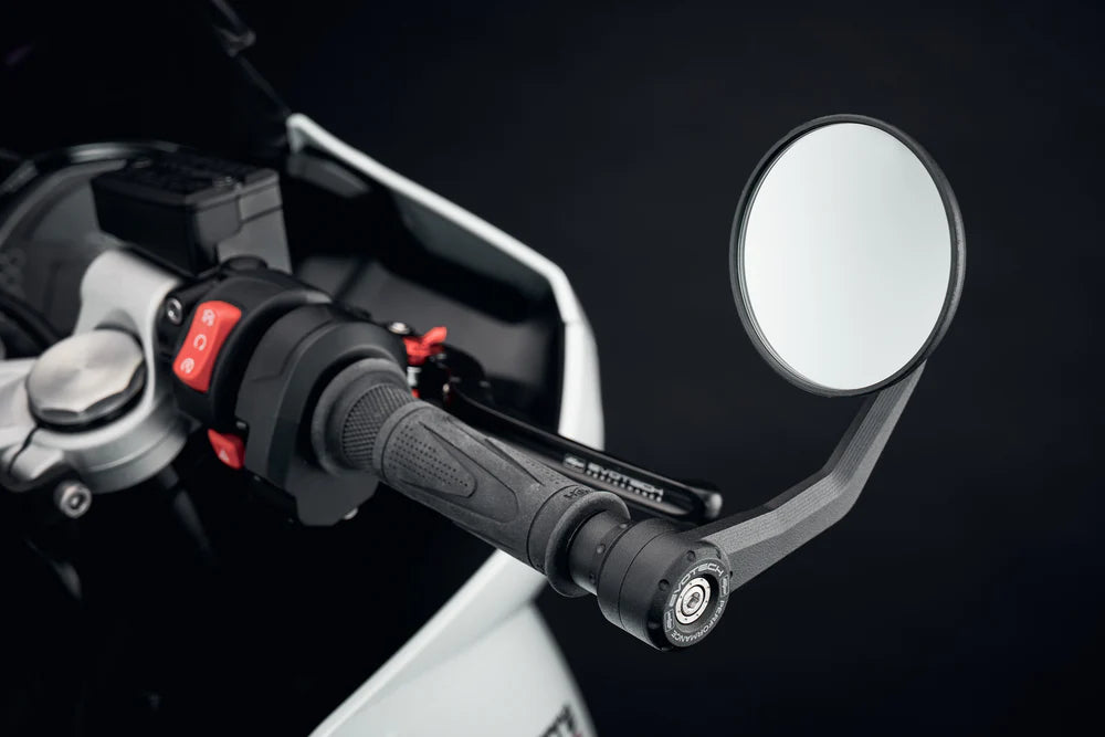 Montés à l'extrémité du guidon, ces rétroviseurs réduisent les reflets des coudes et des épaules, offrant une vue arrière plus dégagée et sécurisée.